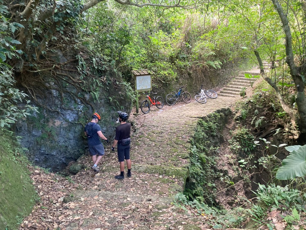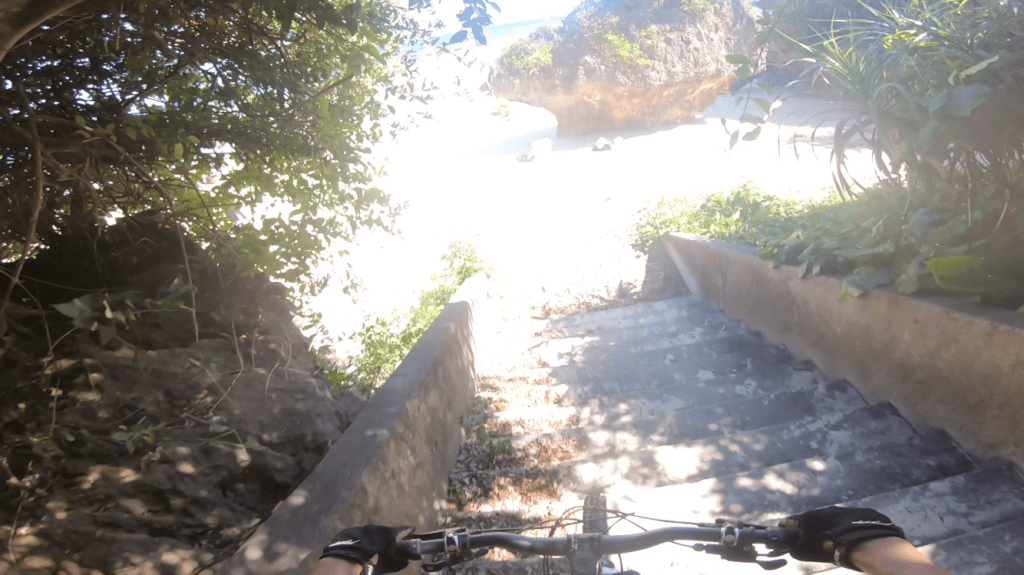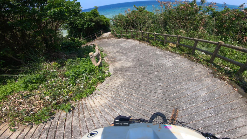 alternative route: Riders can choose to bypass the scenic beauty of the Maeda coast and instead dive into the Kunigami-Sekai Historic Road. It’s not a road! But it is a beautiful little path that takes some riding composure to survive the surprisingly tricky stair descent at the top. This drops you off by a river and two small bridges. It’s a quick sidewalk pedal to the bottom of Ishikawa Kogen Observatory trail.