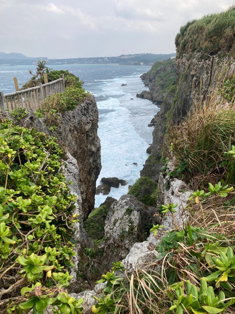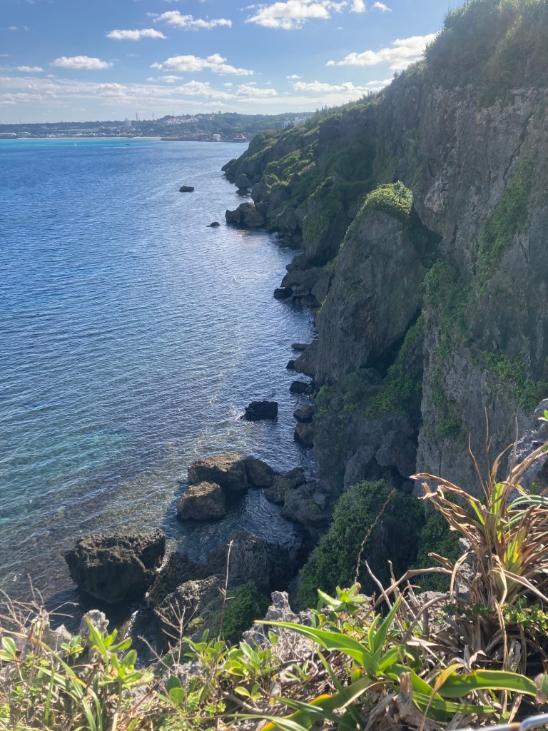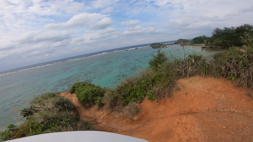 scenic features: Jungle tetrapods, epic views, Zampa Lighthouse, weird square cut beach, a rocky path and platform into the ocean